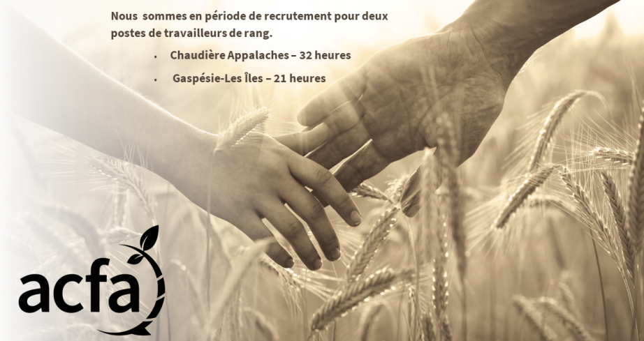 L’organisme Au cœur des familles agricoles (ACFA) a présentement deux postes à combler au Bas-Saint-Laurent (secteurs Ouest et Est) afin de remplir efficacement sa mission, soit celle d’offrir des services psychosociaux de première ligne favorisant l’amélioration du bien-être des familles agricoles sur tout le territoire du Québec.